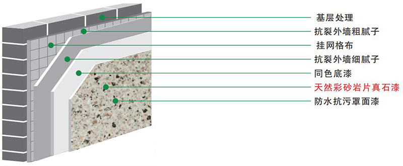 建議配套產(chǎn)品:同色底漆一遍,天然彩砂巖片真石漆兩遍(建議涂裝道數(shù)),專用罩光面漆一遍。