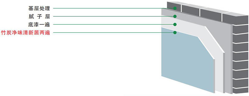 底漆:梨樹園多功能抗堿底漆一遍。面漆:墻面漆涂刷二遍。